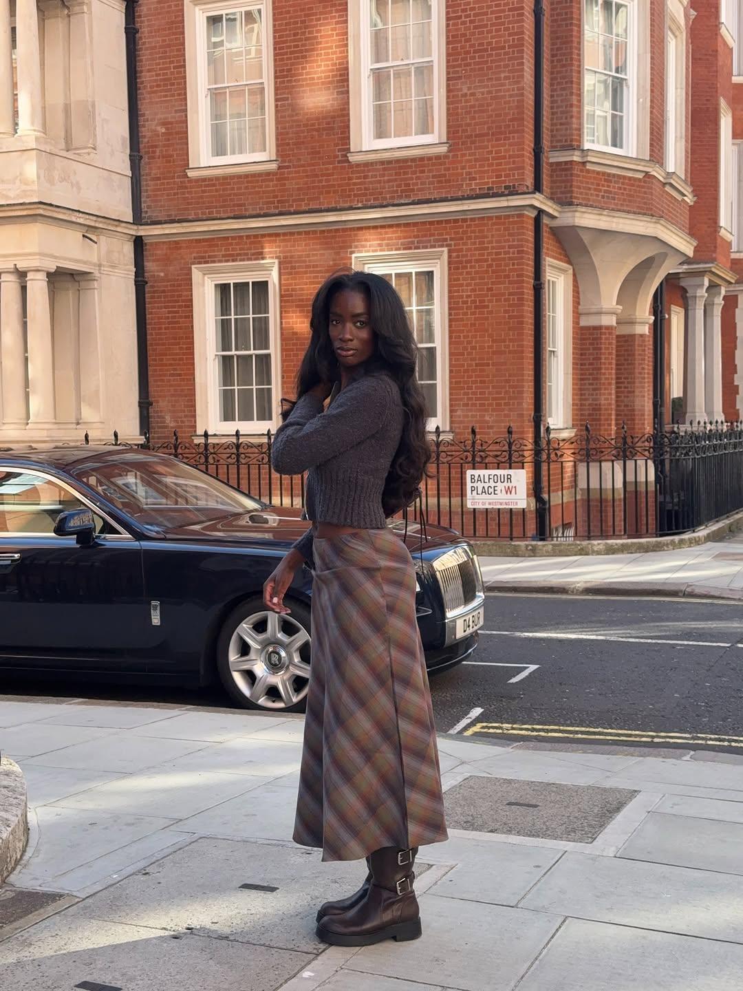 С длинной юбкой или длиной миди образ выглядит элегантно и сдержанно — при этом остается теплым и практичным. Составляй луки по принципу контраста: к мягкой плиссированной юбке смело добавляй лаконичные кожаные сапоги, к плотной шерстяной юбке-карандаш подойдут такие же кожаные сапоги на невысоком каблуке, а к шелковой или атласной юбке можно надеть сапоги с острым носком, чтобы уравновесить легкость ткани.