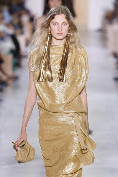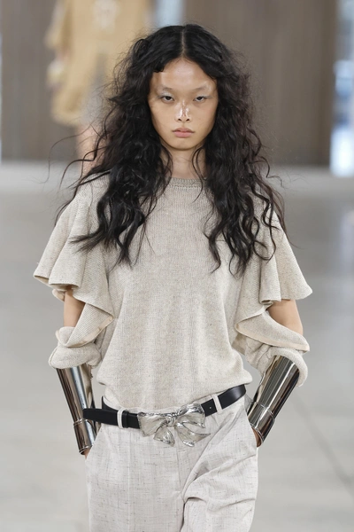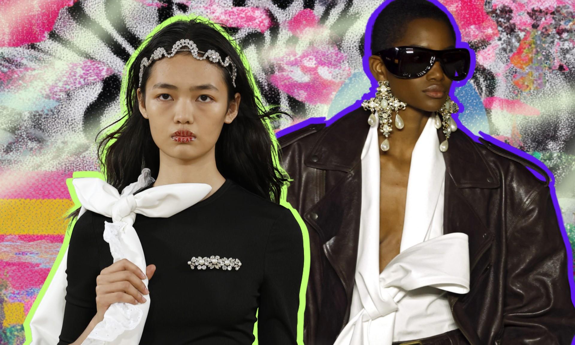 Пожалуй, самые эталонные образы этого сезона с серьгами-канделябрами нужно искать у Saint Laurent (ну или у Ирины Шейк — она тоже фанатка подобных сережек 😁). Энтони Ваккарелло сочетал огромные и увесистые на вид серьги, «расписанные» камнями и переплетениями, да еще и с подвесками вдобавок, со строгими и слегка сексуальными костюмами с юбками-карандашами, белыми блузками с воротником-лавальер и кожаными куртками. Все строго, порой даже аскетично, но эти серьги — главная точка притяжения. Идеальный пример того, как один аксессуар может держать на себе весь образ.