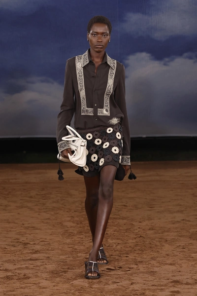 У Toga — другая история: заниженная талия соседствует с авангардными турнюрами, широкими ремнями и строгими белыми рубашками. В Tove дизайнеры предложили кожаные юбки песочного цвета, надетые с рубашками задом наперед — будто игра с классикой, но без насмешки.