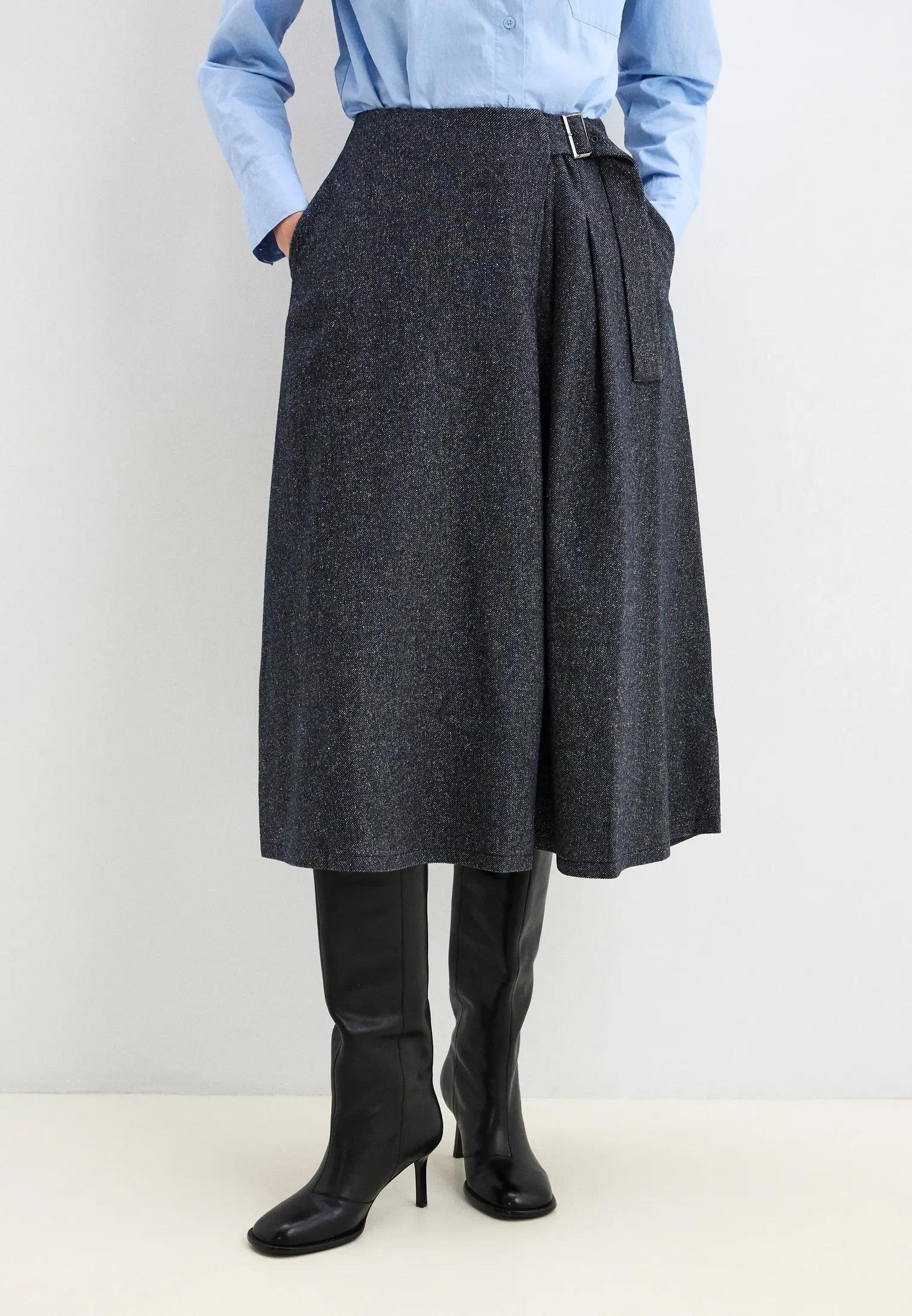 Если хочешь попробовать этот тренд в повседневной жизни, начни с простых сочетаний. Юбка миди А-силуэта с заниженной талией и свободный кашемировый свитер или джемпер-поло — одно из самых удачных решений для осени. Добавь плотные колготки, лоферы или сапоги на невысоком каблуке — и получится расслабленный, но собранный образ в духе современной классики. Главное — не забыть заправить верх в юбку: именно эта деталь делает силуэт актуальным и вытянутым 😉