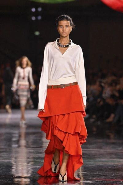 Даже Chanel, обычно осторожный с бохо-элементами, включил в коллекцию ярко-алую юбку с рюшами — и она неожиданно легко вписалась в канон бренда. Цвет, движение, фактура — все работает как один выразительный штрих.