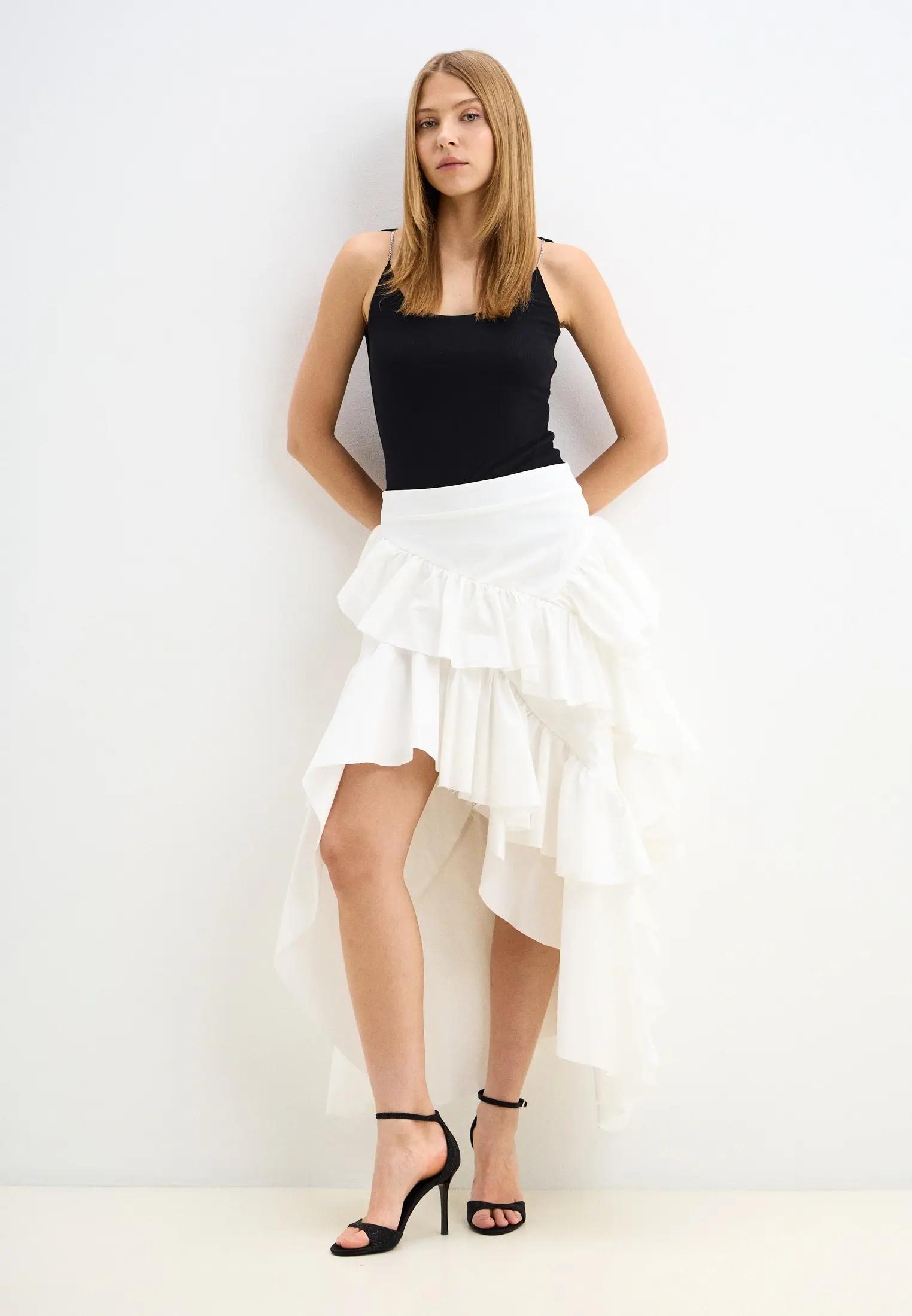 Контраст длины делает образ динамичным, а фактура меха подчеркивает легкость юбки.