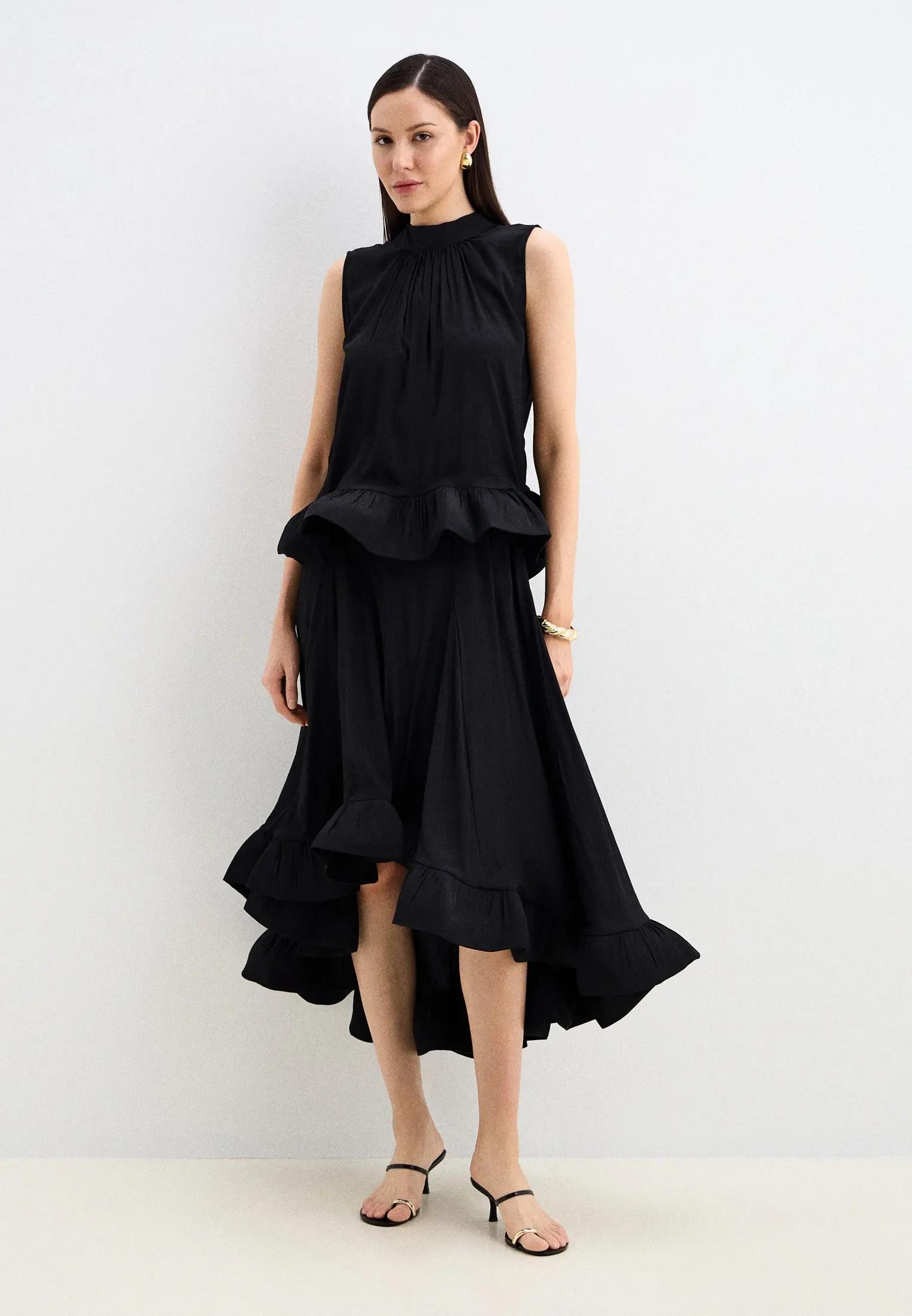 Макси-юбка в богемном стиле идеально вписывается в этот тренд. Она длинная, струящаяся, с живой пластикой ткани, иногда с принтами, иногда с воланами — и создает то ощущение свободы, которое так хорошо сочетается с плотными зимними фактурами. Дизайнеры будто вспомнили, как приятно двигаться в одежде, которая подстраивается под тело, а не сковывает его.