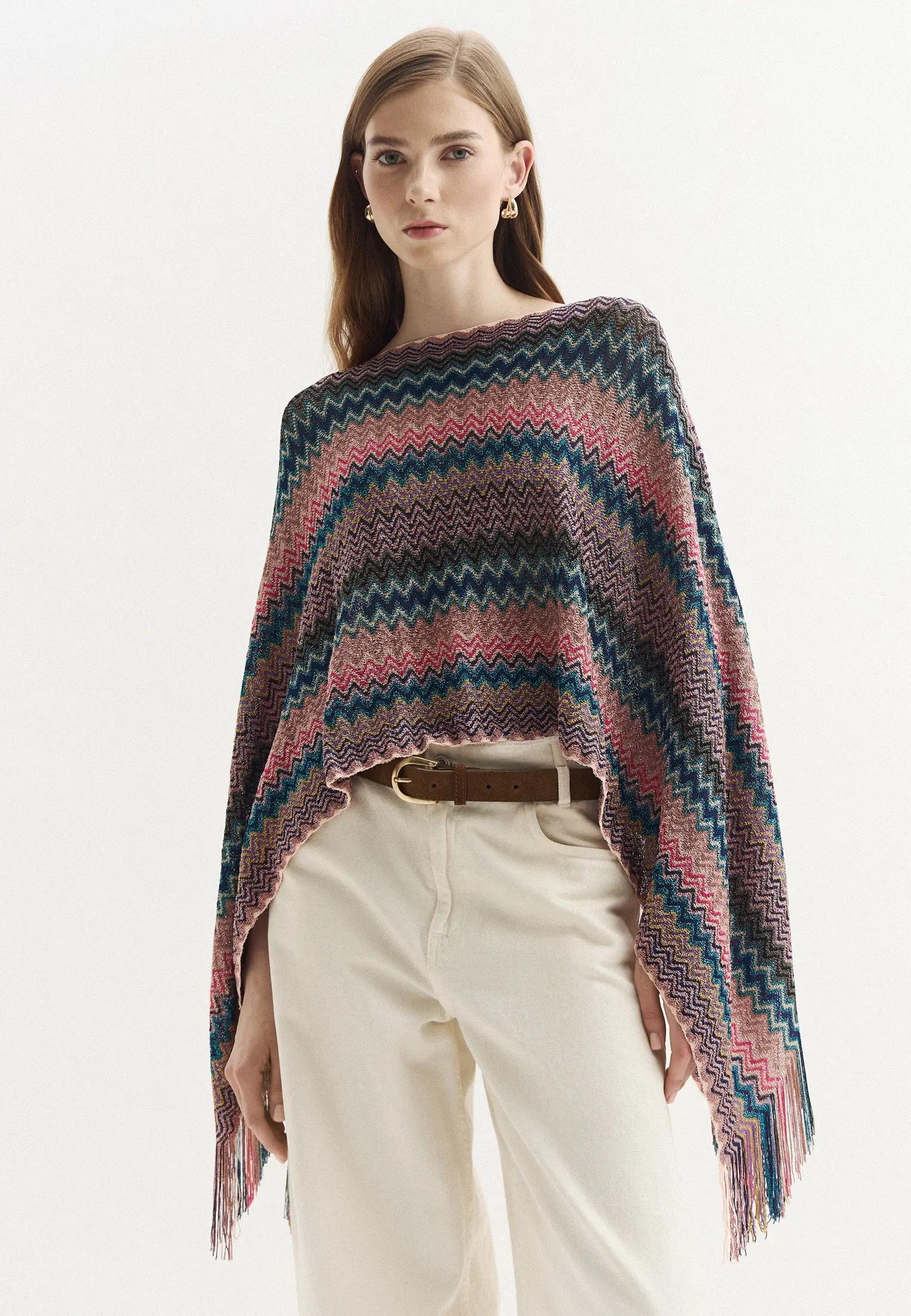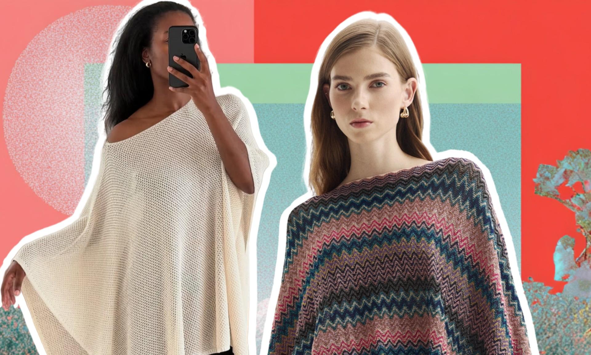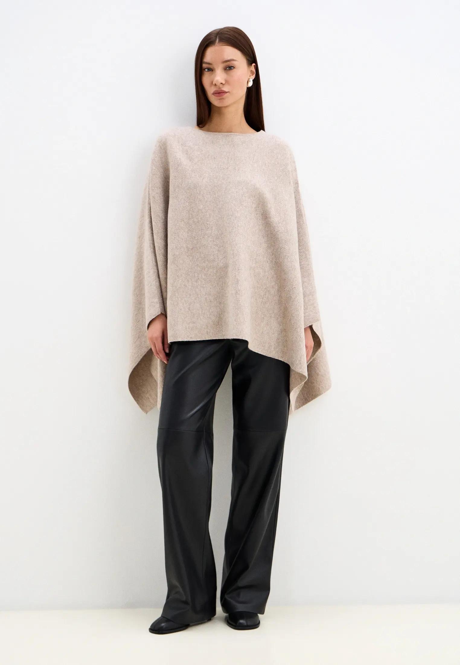 Кроме того, пончо отлично отвечает климатической реальности межсезонья. Оно легко наслаивается поверх рубашек, тонких джемперов, платьев, не сковывает движения и подходит для переменчивой погоды. Это не вещь на выход и не сугубо практичный элемент — скорее универсальный слой, который делает образ цельным.