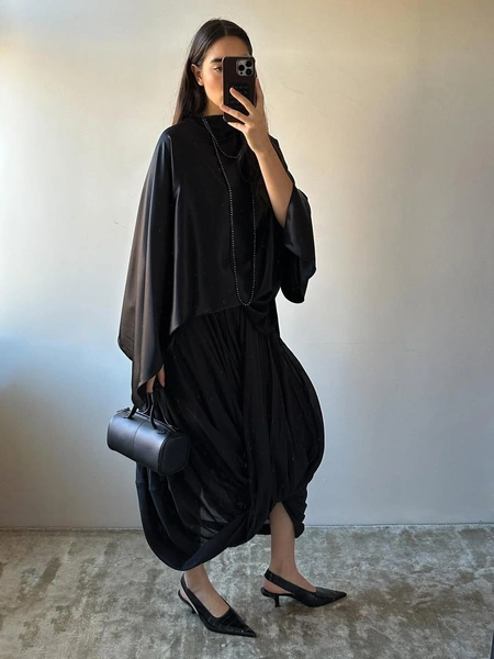Самое приятное в пончо — его универсальность. Оно одинаково хорошо работает с джинсами прямого кроя, широкими брюками, юбками миди и даже поверх легких платьев. Главное правило — не перегружать низ. Пончо любит спокойную базу, которая дает ему пространство для движения.