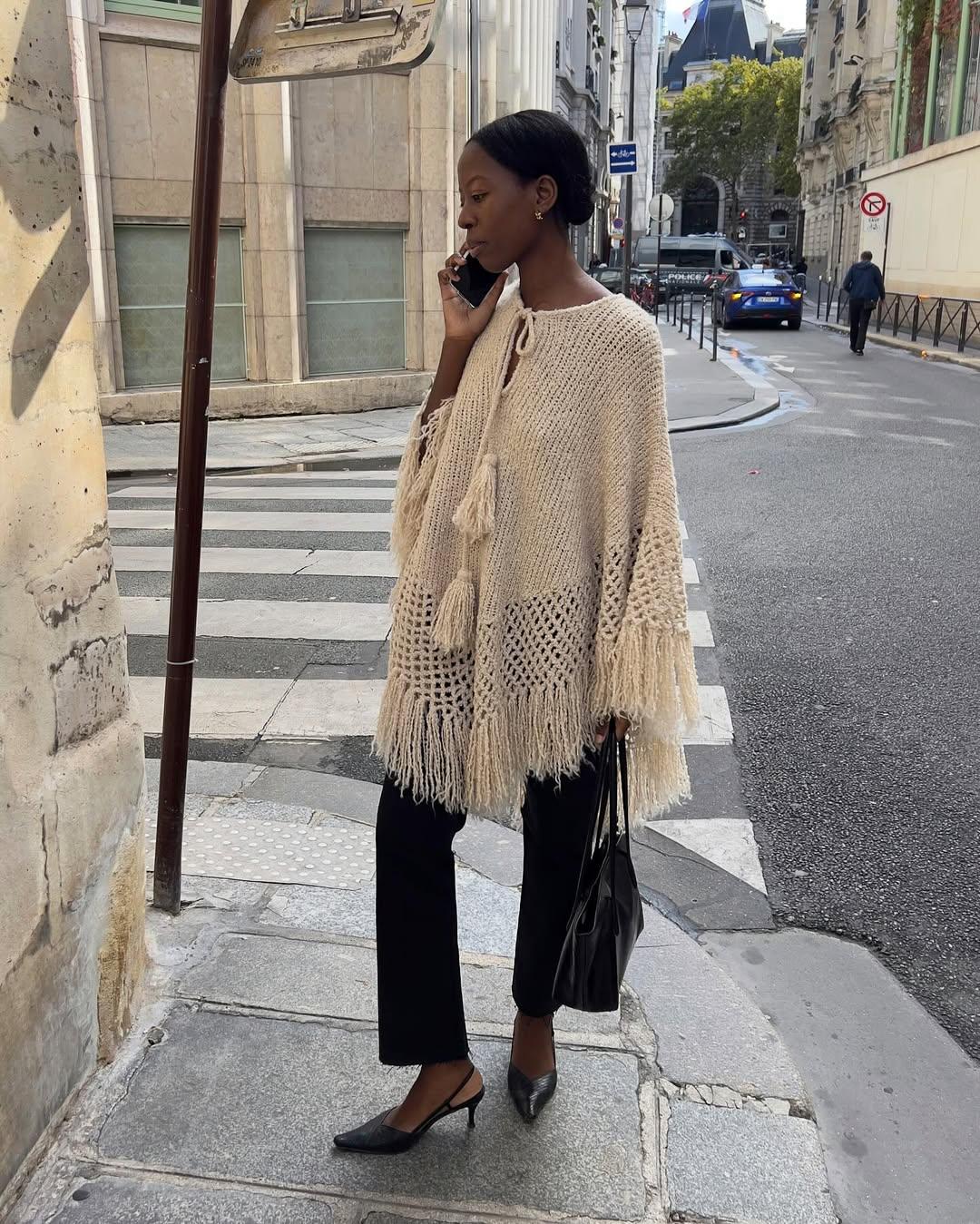 Если ты выбираешь объемное пончо, пусть остальные вещи будут более собранными. Аккуратные ботинки, лаконичные сумки, минимум украшений. В более теплую погоду пончо можно носить как верхний слой вместо куртки, а в прохладные дни — накидывать поверх жакета или плотного трикотажа.