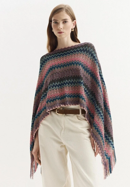 Пончо с узором сегодня ценится почти как винтаж: такие модели выглядят характерно и добавляют образу глубину без излишней театральности. Но и однотонные варианты не уступают — особенно в натуральных оттенках: песочном, молочном, коричневом, приглушённом терракотовом.