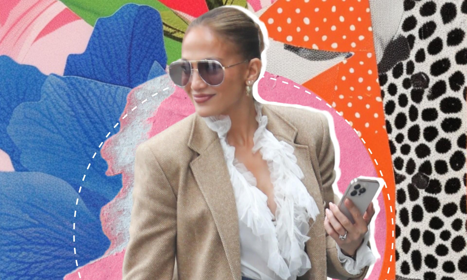 Первое, что привлекает внимание в образе Джей Ло, — белая блузка с жабо. Легкая, почти воздушная ткань, пышная отделка на V-образном вырезе и слегка объемные рукава делают этот элемент наряда центральным. Такие блузки сегодня переживают настоящий ренессанс: дизайнеры щедро наполняют ими свои коллекции, превращая классический атрибут старинных костюмов в предмет повседневного гардероба.