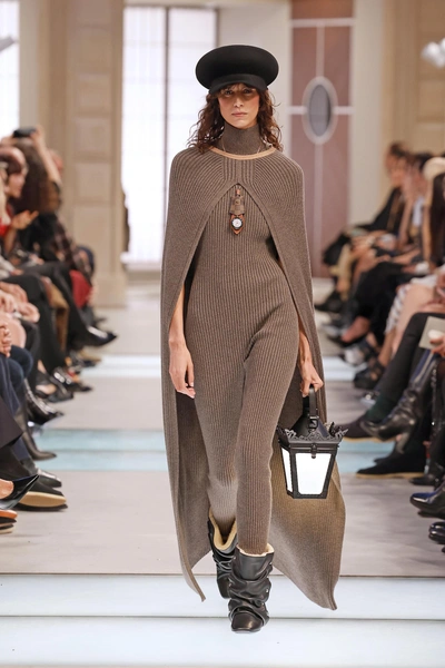 Тема дороги логично привела Жескьера к плащам и накидкам. В коллекции они появились в разных вариантах: от легких трикотажных до более плотных, почти архитектурных. Кейпы красиво ложатся поверх слоев и создают ощущение движения даже в статике.