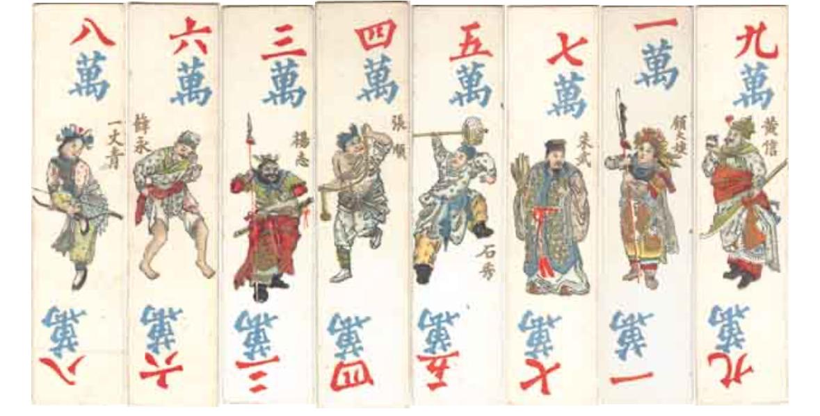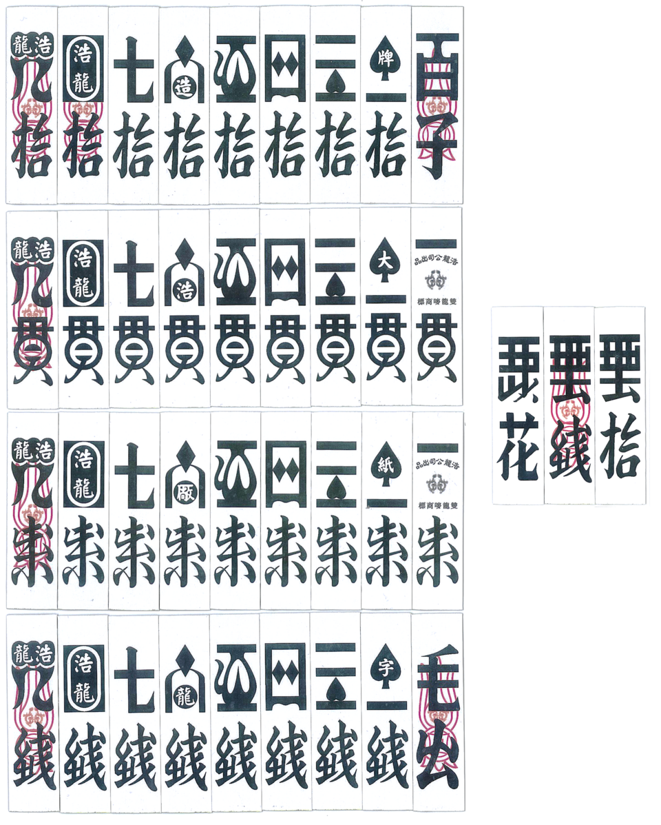 Но самая популярная колода — с изображением денег. На карты наносили рисунок с древних бумажных банкнот и делили их на три масти: монеты, связки монет и мириады связок монет. А еще были три дополнительные карты с разными печатями и надписями — «Красный цветок», «Белый цветок» и «Старая тысяча».