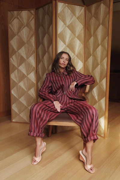 Базовым вариантом на жаркое лето становятся костюмы из льна, в составе которых есть поливискоза. Именно она помогает ткани меньше мяться и лучше держать форму. Для составления более расслабленного образа можно выбрать костюм в винно-малиновом оттенке.