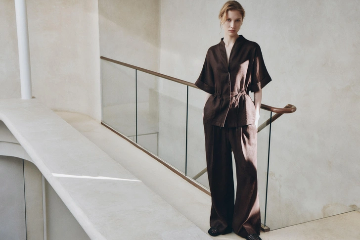В числе главных новинок — максимально лаконичные комплекты. К примеру, блузка на кулиске в шоколадном цвете, топ с открытыми плечами из ткани в оттенке металлик и меланжевый блейзер расслабленного кроя.