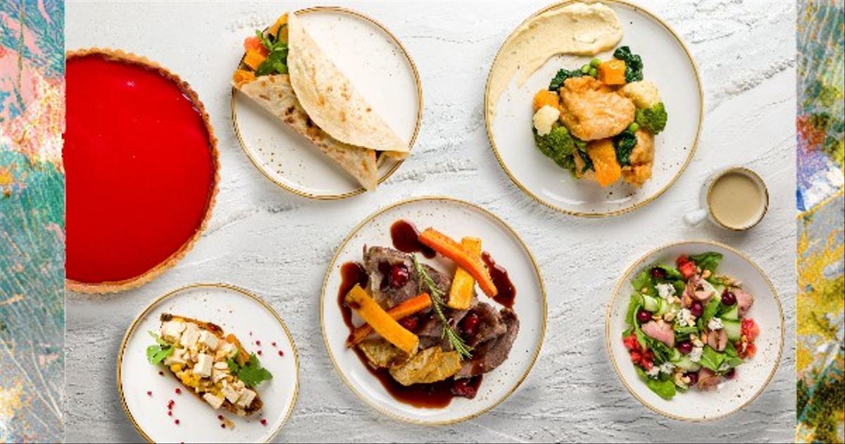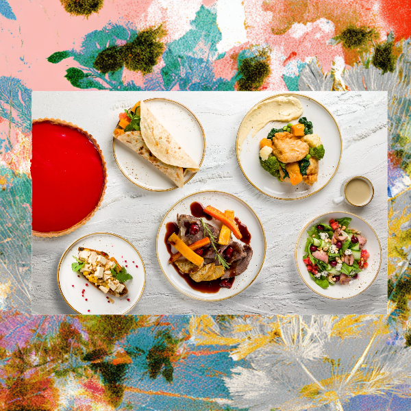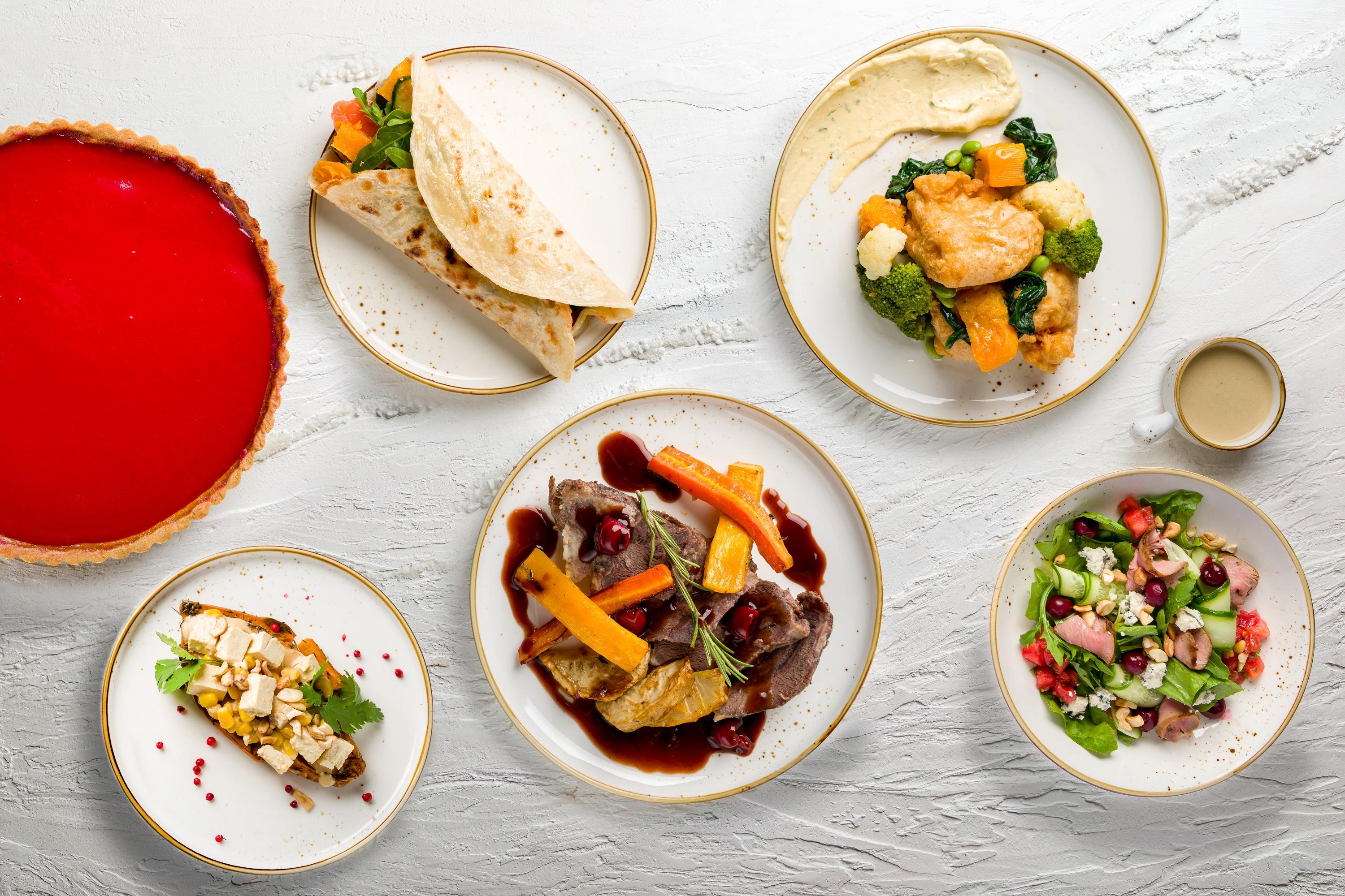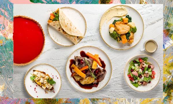 Меню получилось ярким и совершенно осенним. Например, ролл роти с лососем, вялеными томатами и тыквой или печеный батат с кукурузой и сыром тофу — легкое, но сытное блюдо, которое будто создано для обеда в холодный день.